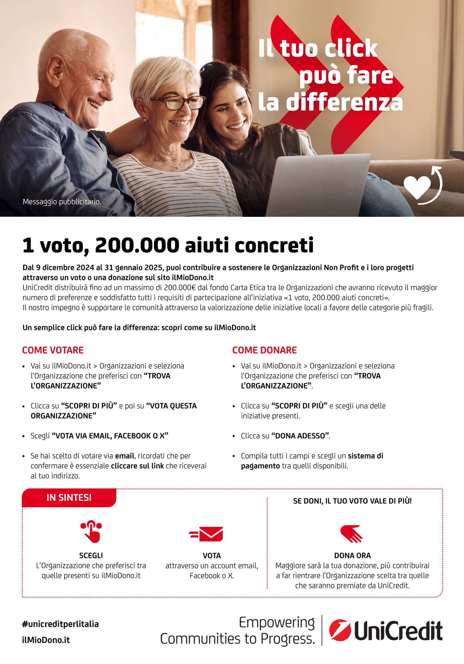 Dal 9 dicembre 2024 al 31 gennaio 2025, tutti possono fare la differenza supportando le Organizzazioni Non Profit e i loro progetti attraverso un voto o una donazione su ilMioDono.it. L’iniziativa promossa da UniCredit mette a disposizione fino a 200.000 euro dal fondo Carta Etica per le organizzazioni che riceveranno il maggior numero di voti e soddisferanno tutti i requisiti previsti.